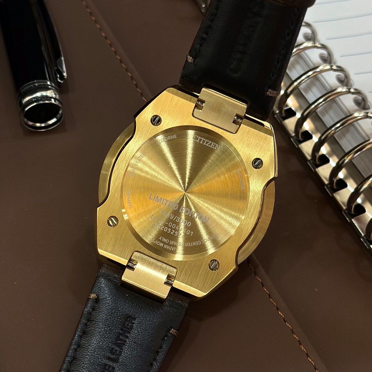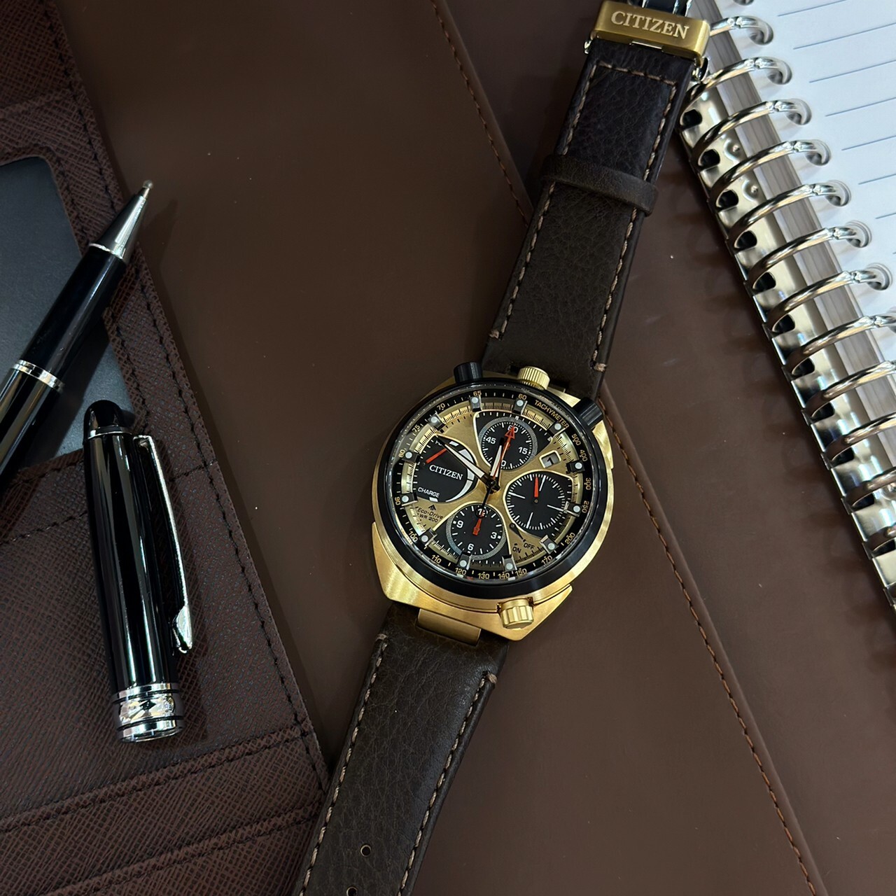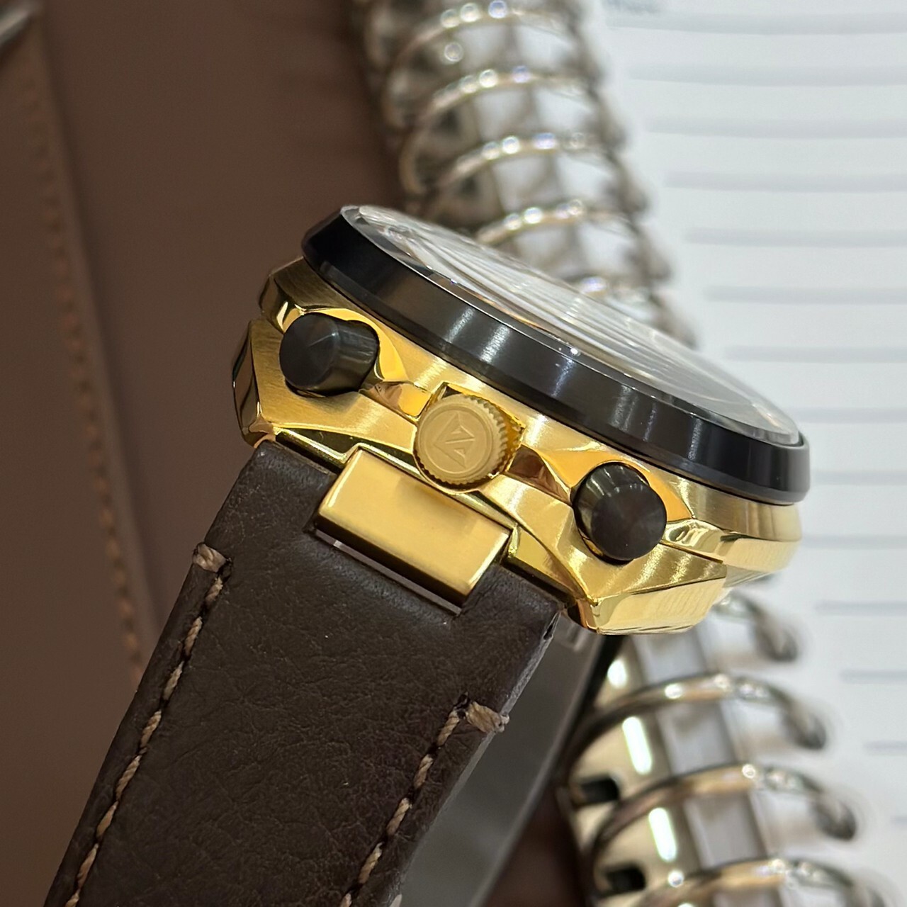 • 配備 44.5mm雙色不銹鋼錶殼,金色錶盤,並由時尚的棕色皮錶帶固定。