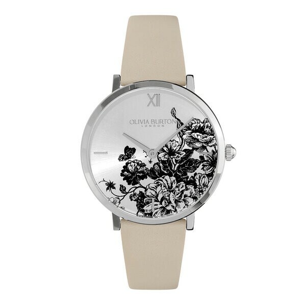 • 美麗的英式手繪花卉在銀色太陽紋錶盤上綻放