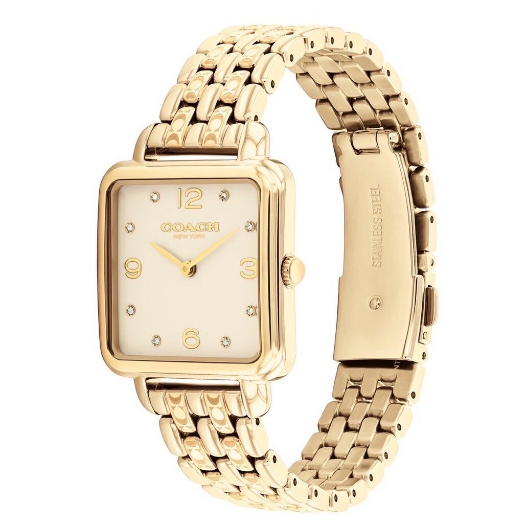 • 方形金色錶盤,搭配實驗室培育水晶