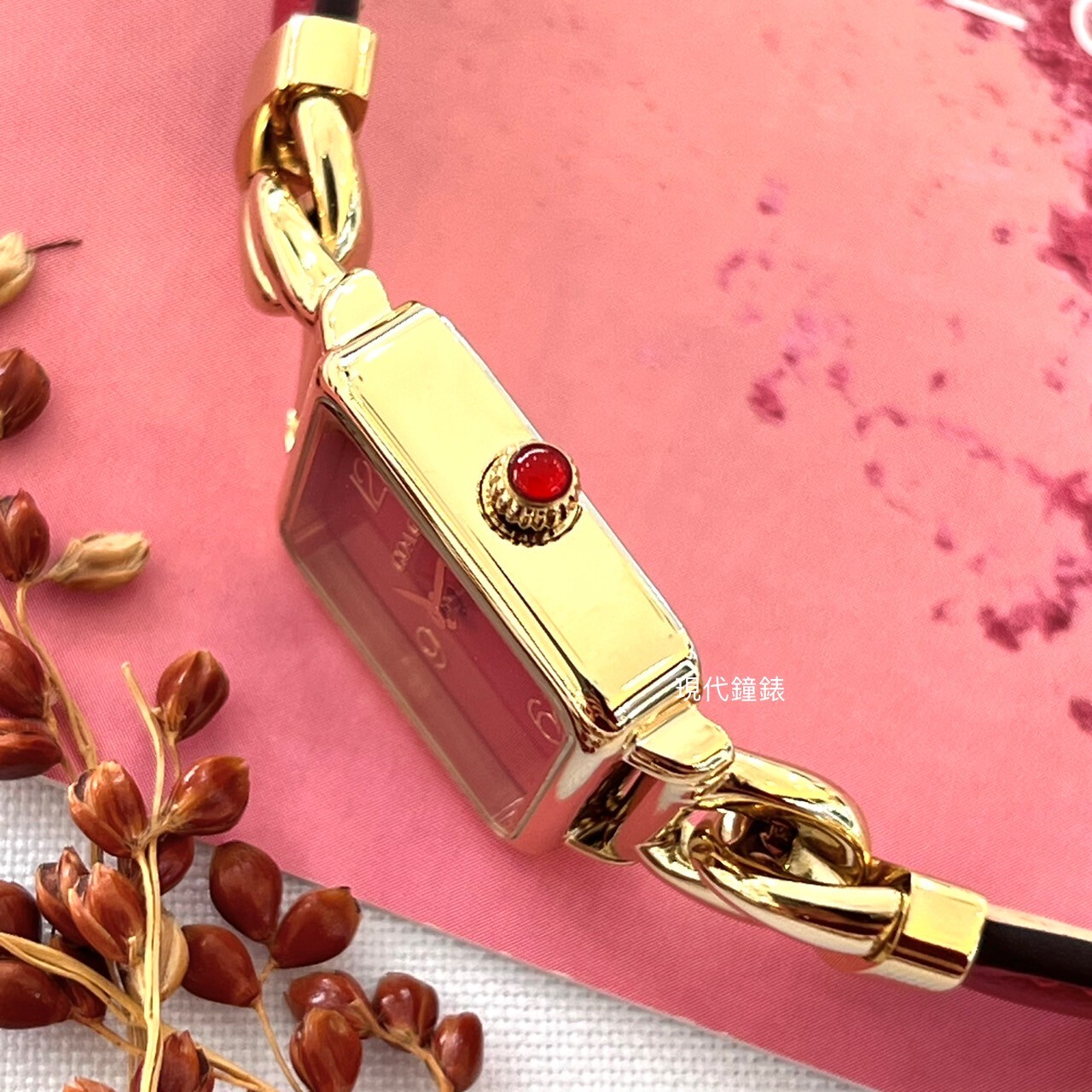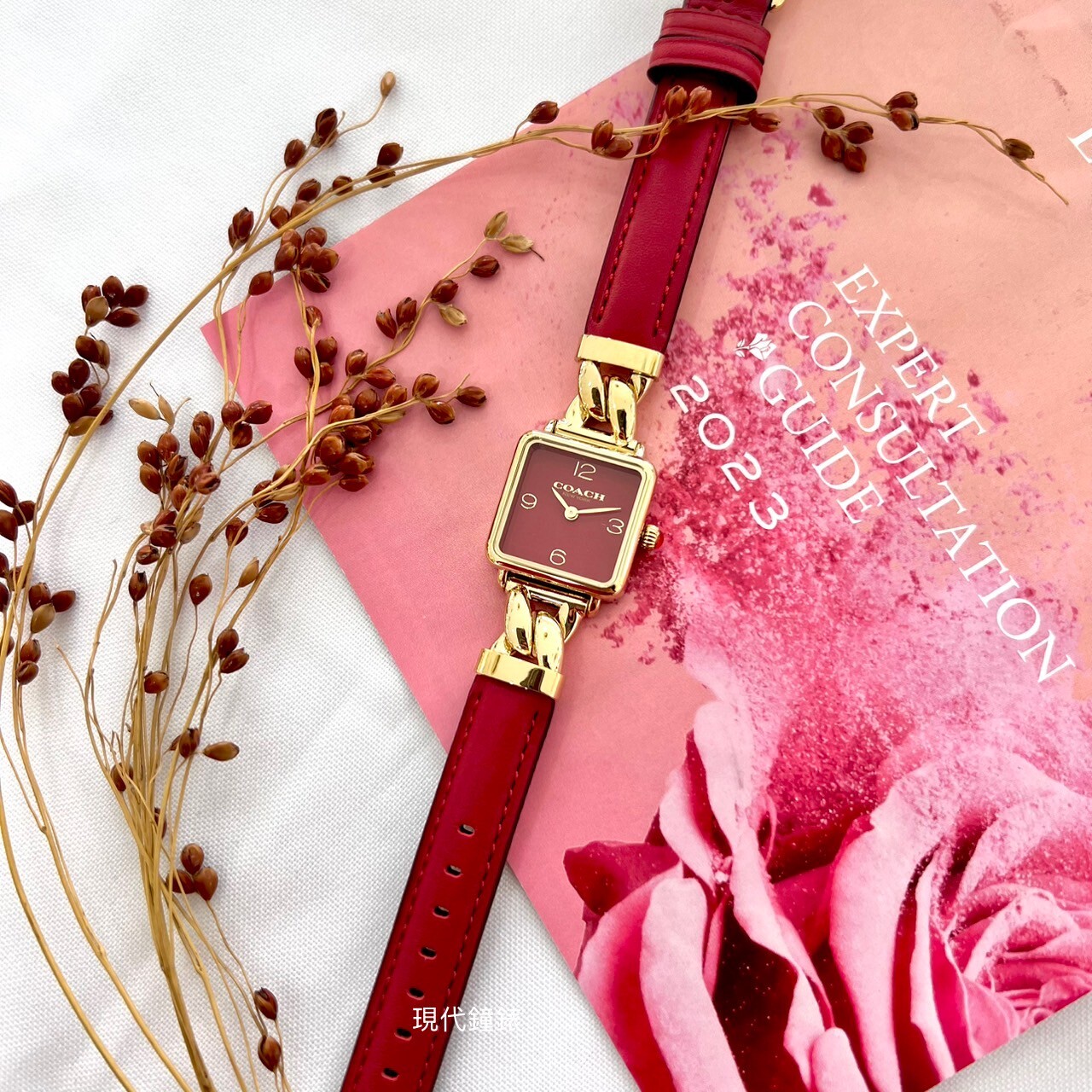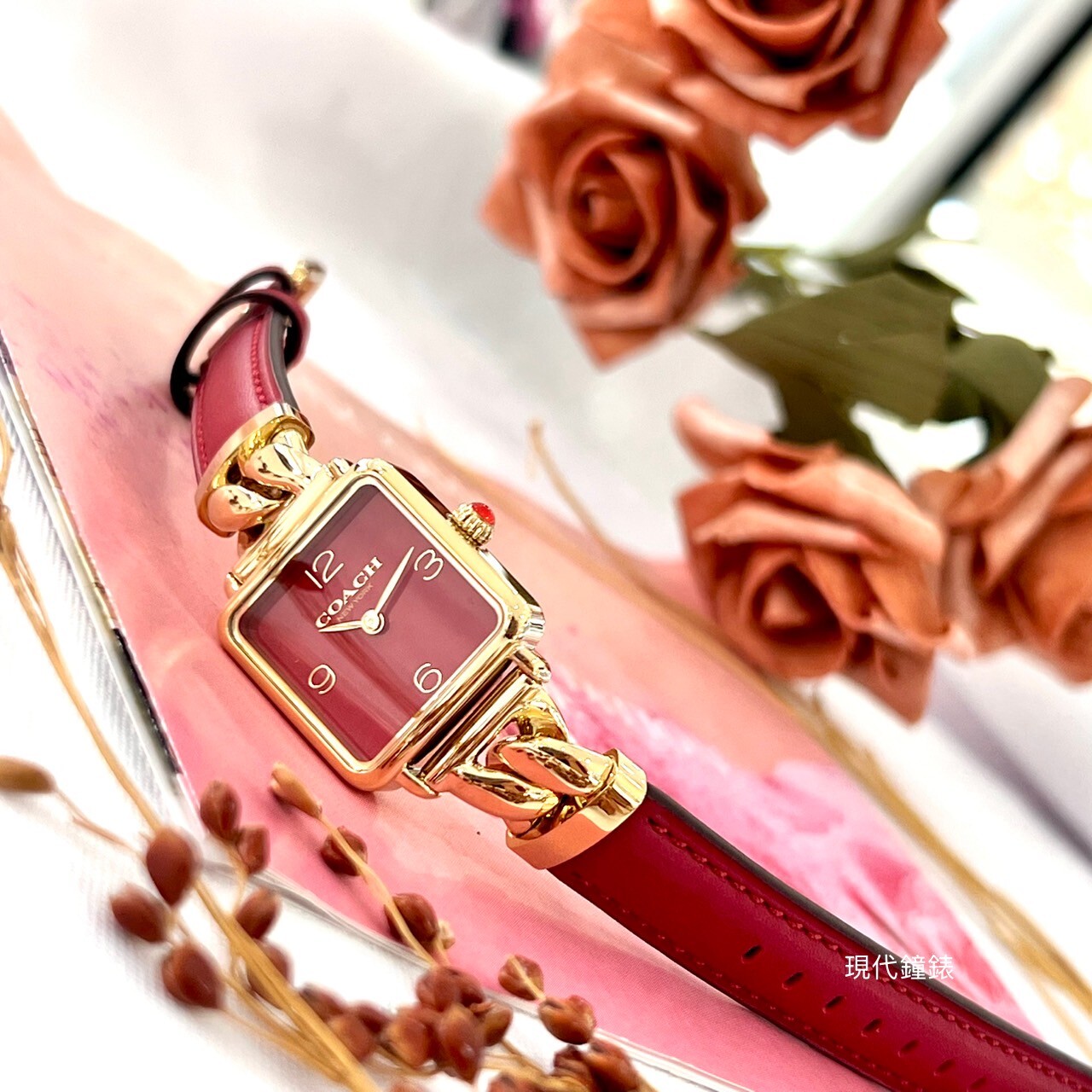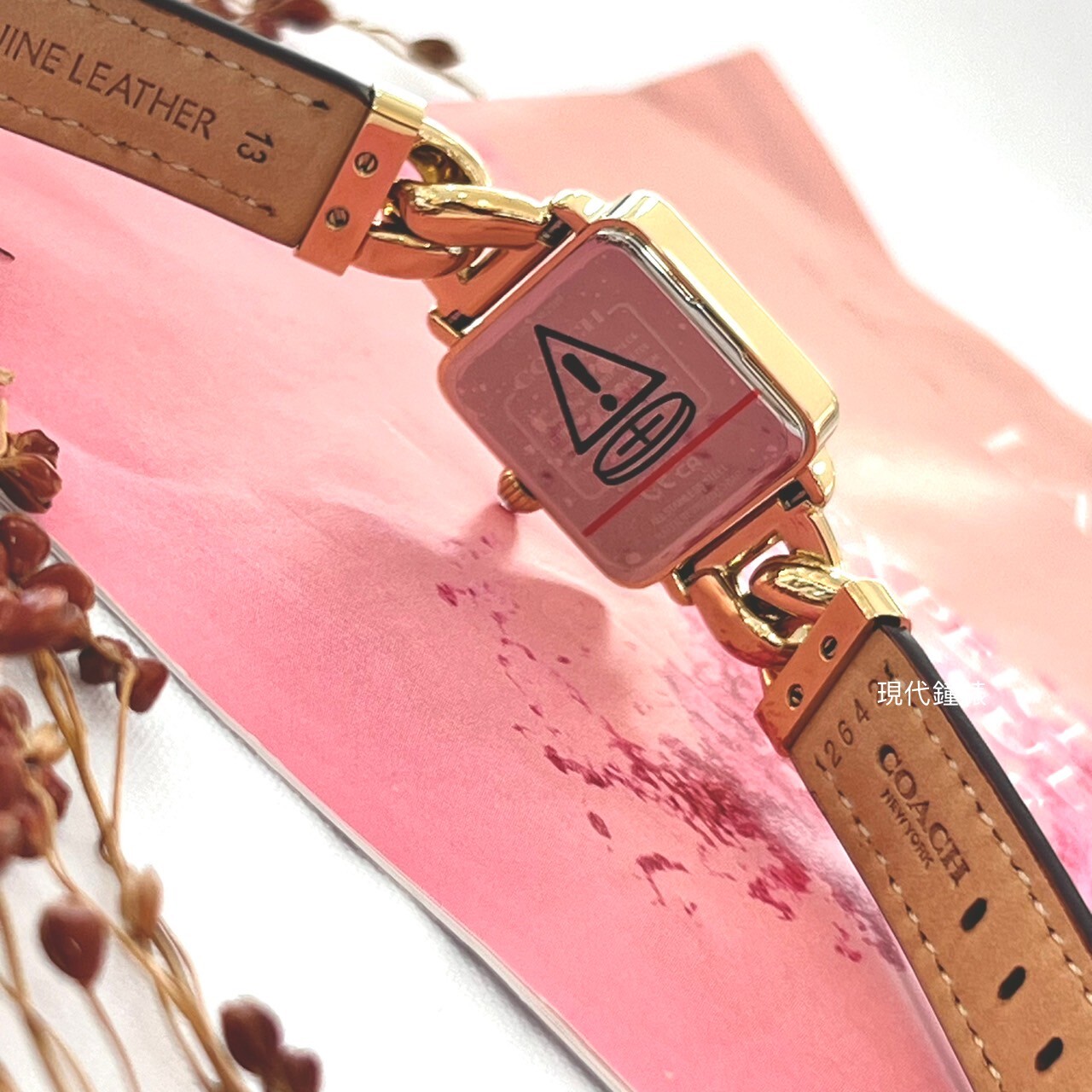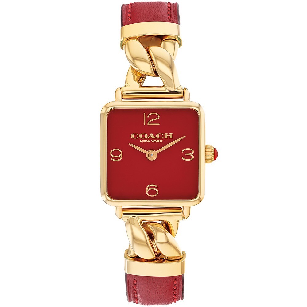 【COACH】方形紅面皮革拼接鏈帶錶CO14504358 22mm 現代鐘錶
